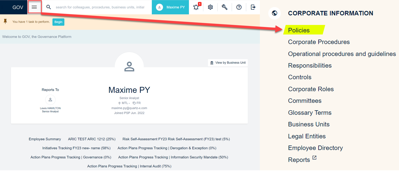 From the QuartzGOV homepage click on 'policies' in the corporate information module to display the list of all corporate policies.