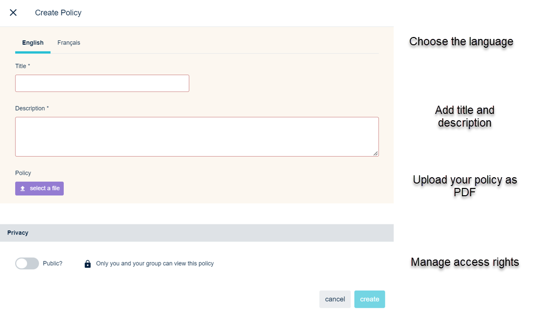 A create policy screen will appear. Choose the language you created the policy in and add a title and description. You can upload your policy as PDF. You can manage the policy access with the 'policy' button in the 'privacy' field. By default only you and your group can view the policy. You can pull the trigger if you want to make your policy public to everyone in your organization.