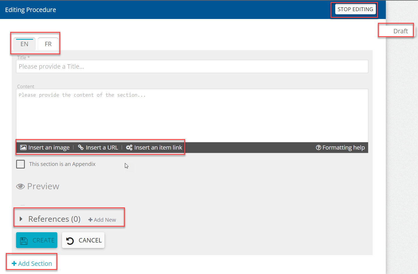 When your editing is complete, click on the 'Stop editing' button. The procedure will appear as a draft until its publication. Only users with the 'Pilot-procedureManagement' role are able to see procedure that are in the draft status.