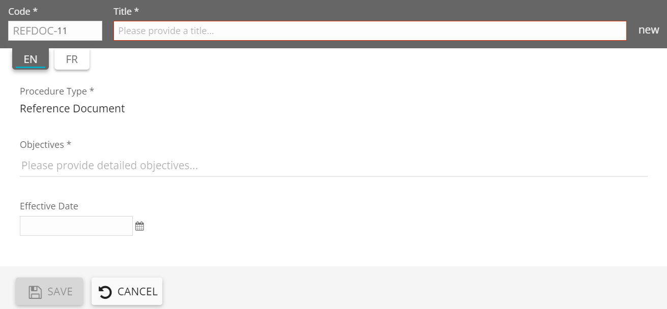 Click on 'operational procedures and guidelines' button from the 'create' menu. The operational procedure creation screen will appear: