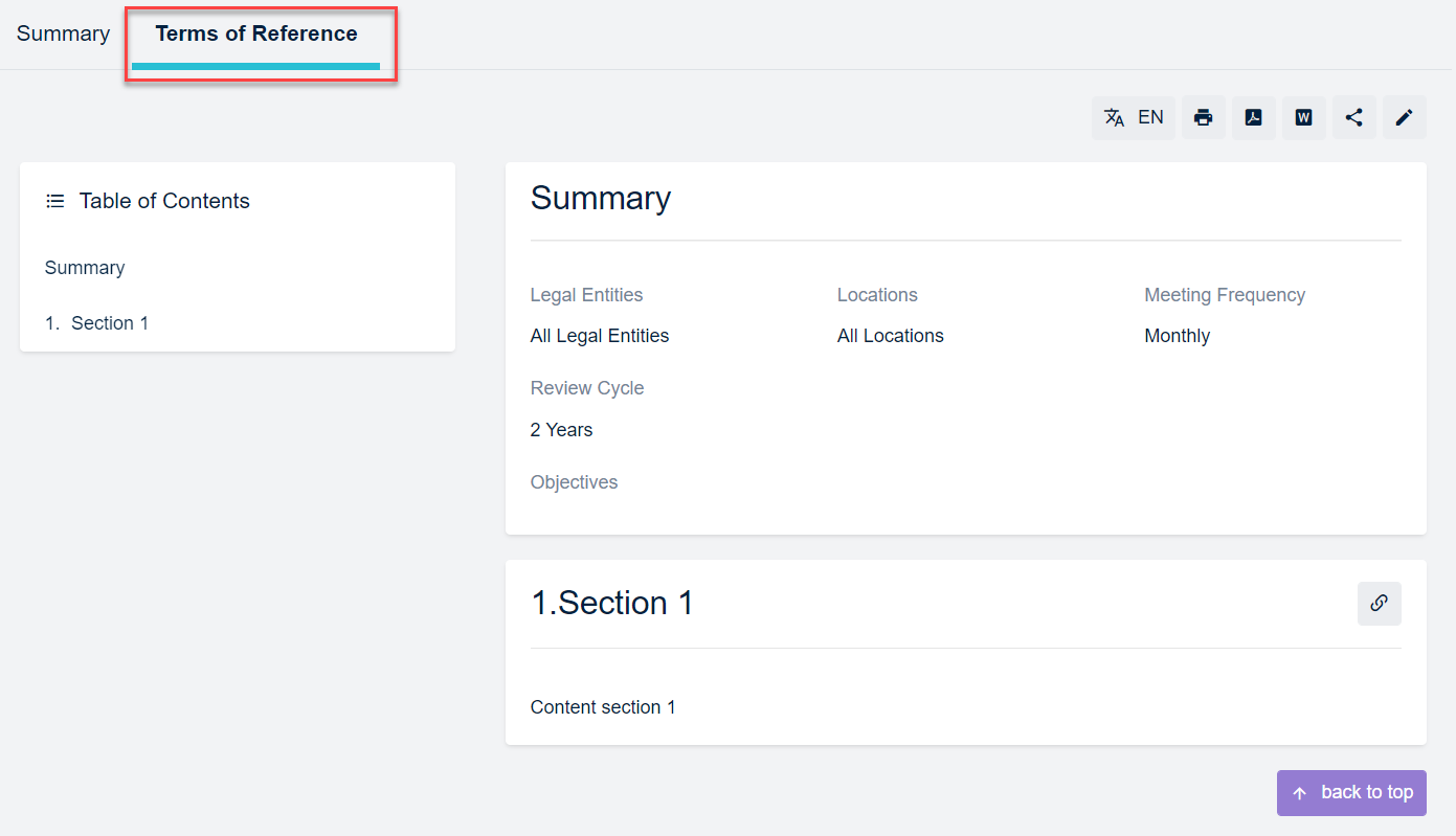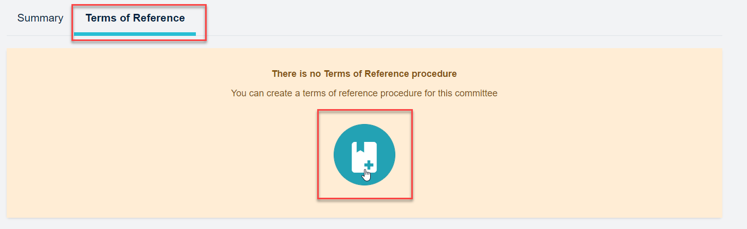 To create the new Terms of reference, you can follow the creation process listed in section 2. Procedures management. The terms of reference procedure will appear on the 'terms of reference' screen from the detailed committee view.