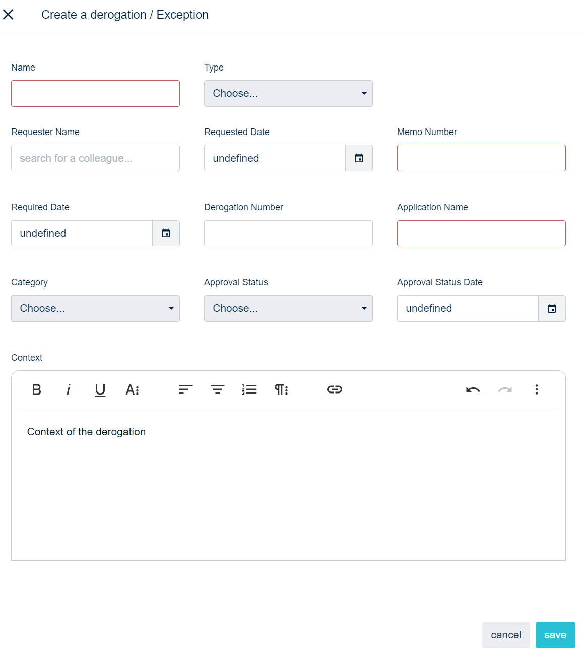 From the QuartzGOV homepage, click on the 'Derogation' button in the 'create' menu. A derogation creation screen will appear. From this screen, you can: