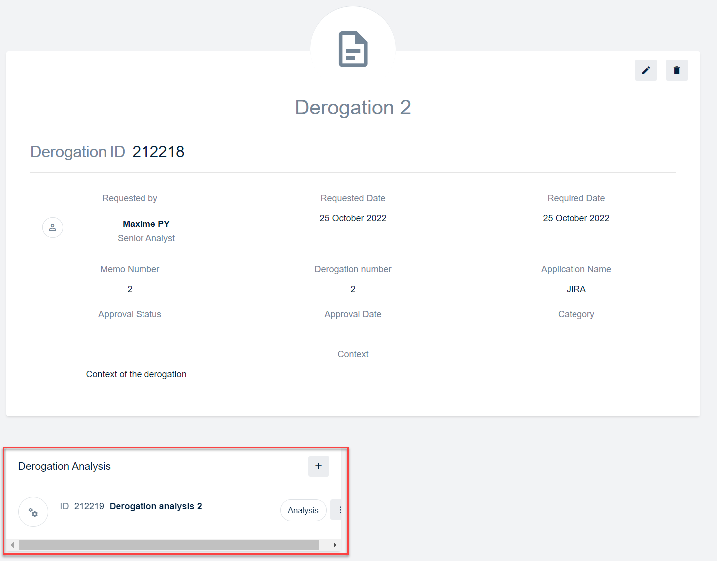 You can also access to a derogation analysis from the detailed view of the associate derogation.