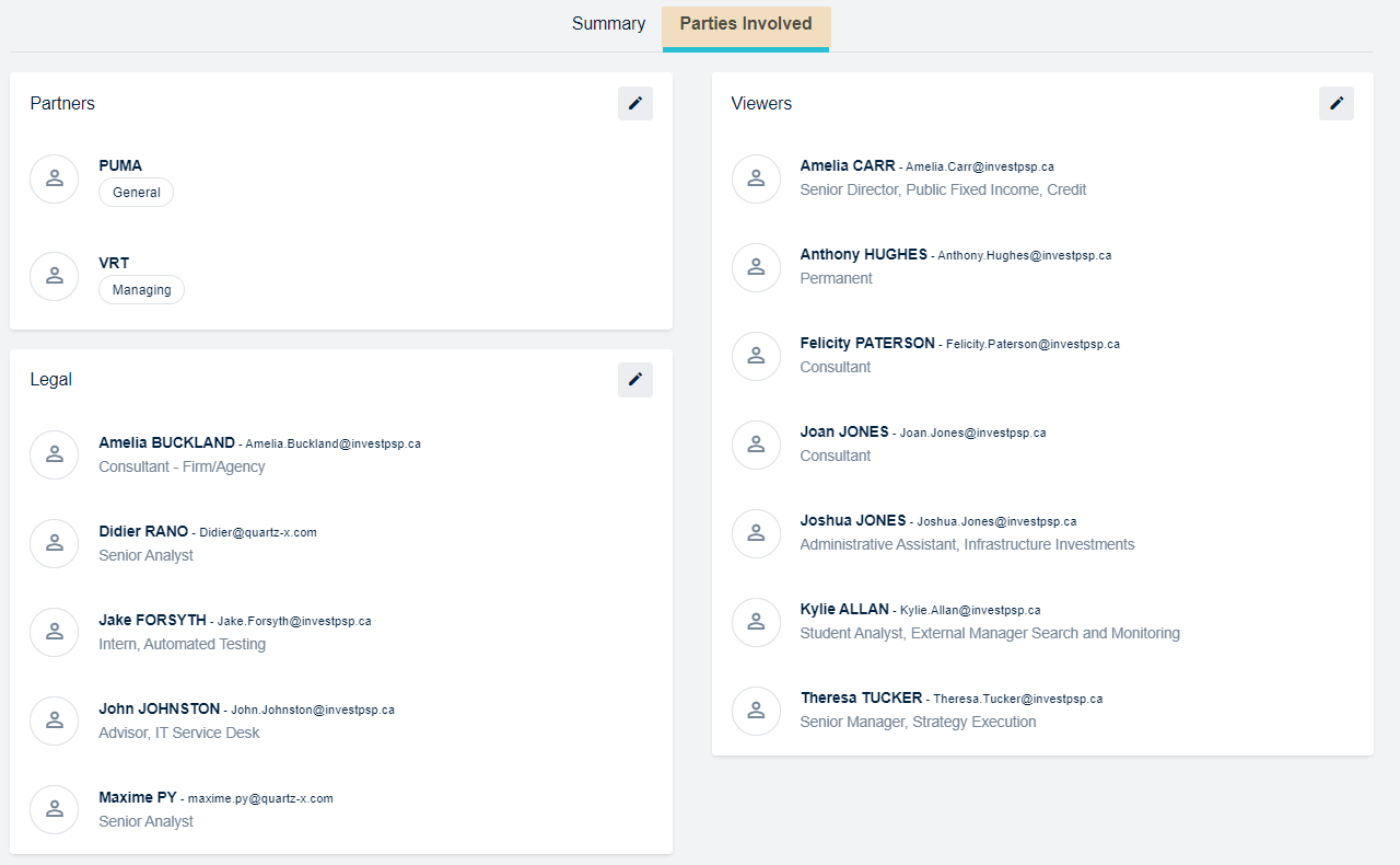 From the 'ongoing invstements' list, click on the deal you want to open in order to display the deal detailed view. This view contains a 'summary' tab and a 'parties involved' tab.