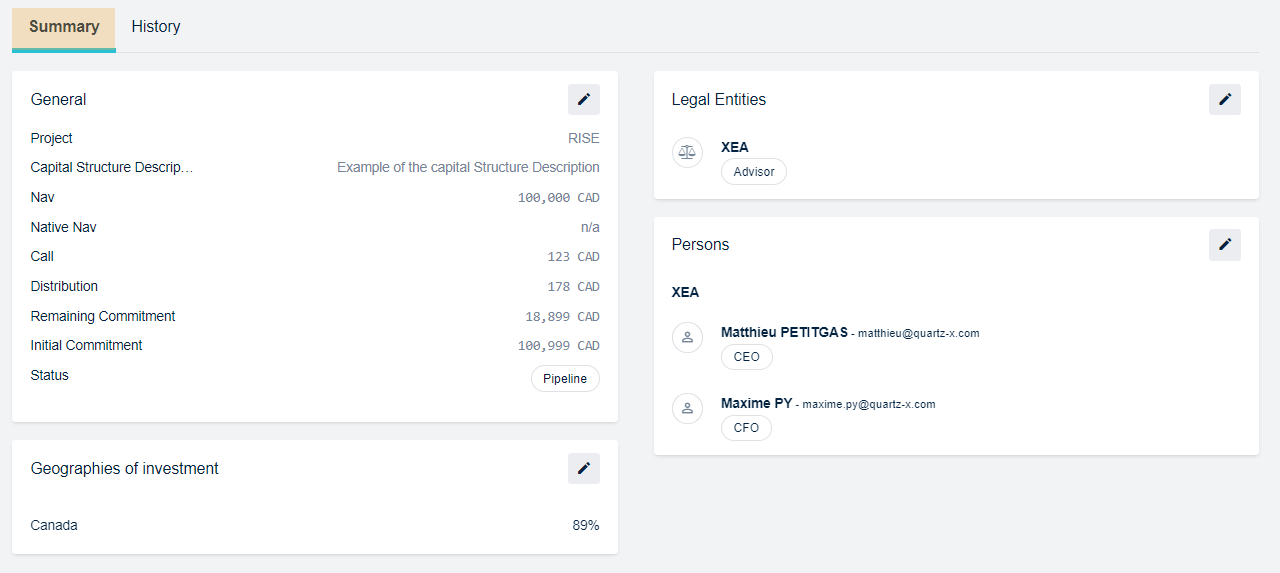 From a deal detailed view, click on the investment you want to complete in order to open the investment detailed view. This view countains a 'summary' tab and an 'history' tab.