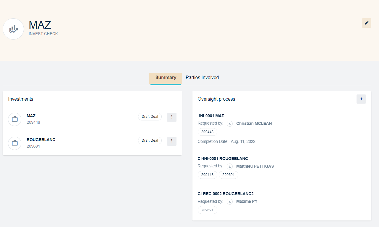 The summary tab allows to display investments and oversight process linked to the deal. From this view you can also update the name of the deal by clicking on the 'edit' button.