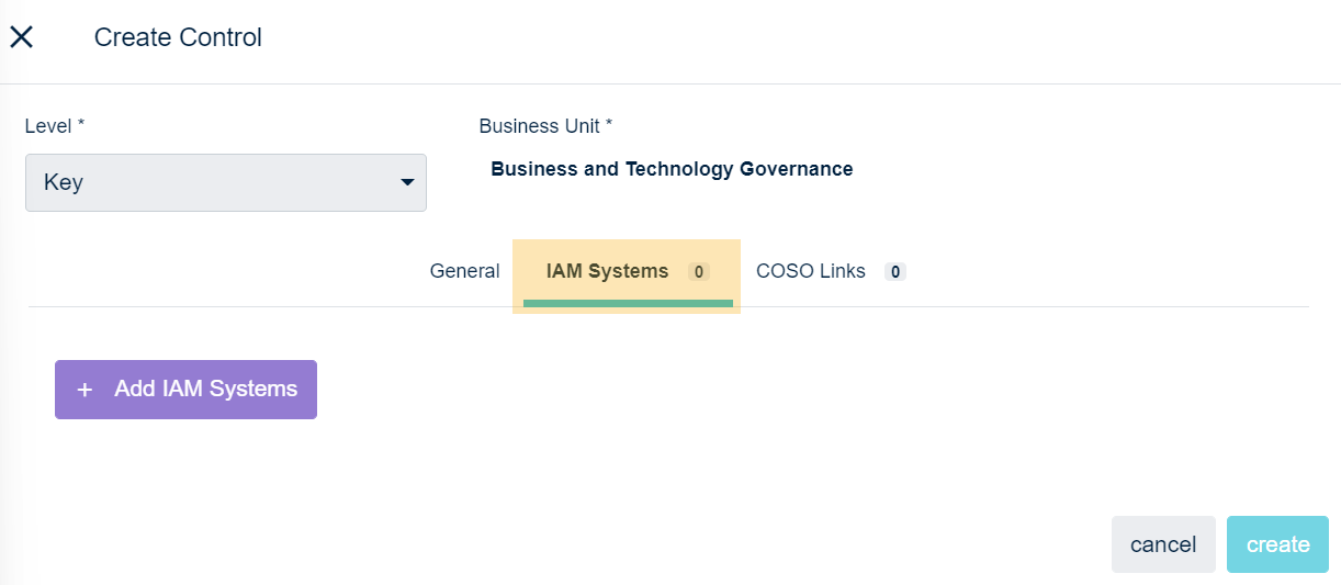 The 'systems IAM' section displays IAM systems linked to the control. You can update them if necessary.